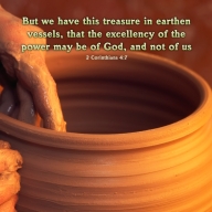 Finally, I can only draw from my own thoughts and experience – and it will always be with limitation and infirmity. This is not to detract from the greatness of the message; but to admit the frailty of the messenger. Apostle Paul puts it best: But we have this treasure in earthen vessels, that the excellence of the power may be of God and not of us (2 Cor 4:7). Having referred to the unsurpassed New Covenant glory in the previous section, Paul is humbled by his calling as one of its ministers (3:6). He combines these two thoughts – calling the New Covenant message as treasure, though he as its messenger is but an earthen vessel.